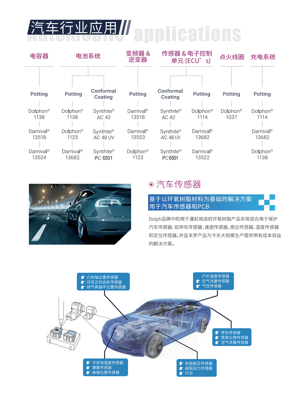 我们的灌封树脂产品线非常适合保护大多数传感器,包括停车传感器、速度传感器、电感传感器、自动驾驶传感器、气压和气流传感器、温度和定位传感器以及轮胎压力和制动压力传感器。为当今的大批量生产运行提供具有成本效益的解决方案。